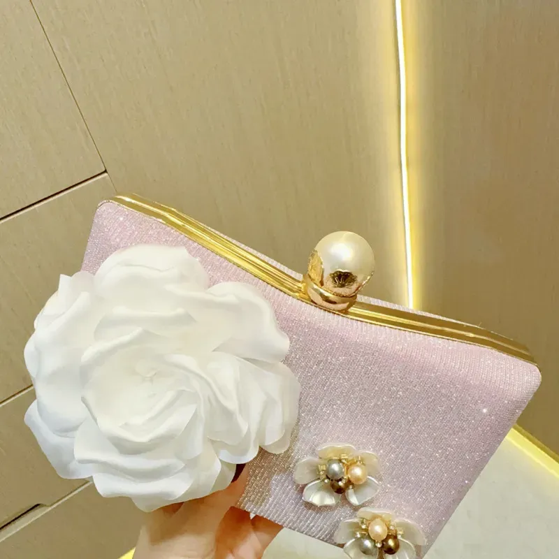 Women Fashion Elegant Three-Dimensional Pearl Floral Square Evening Bag
