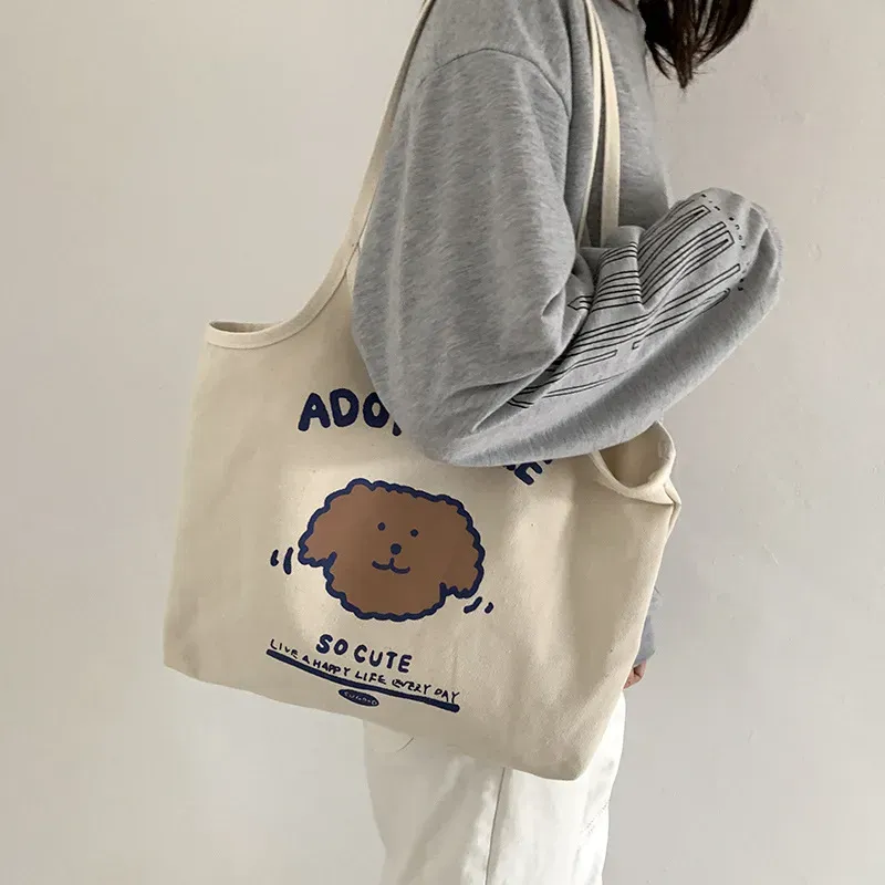 Women Cartoon Cute Letter Bear Printed Large Capacity Canvas Tote Bag