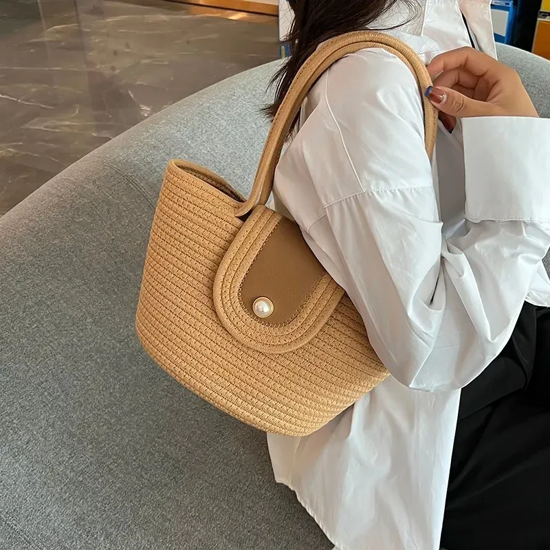 Women Fashionable Simple Pearl Flap Straw Woven Large Capacity Tote Bag