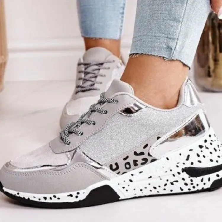 Women Fashion Casual Plus Size Leopard Round Toe Lace-Up Sneakers