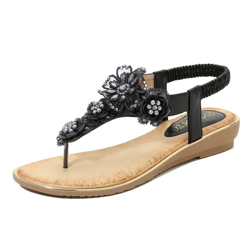 Women Fashion Casual Floral Rhinestone Round Toe Flip Flops Wedge Beach Sandals