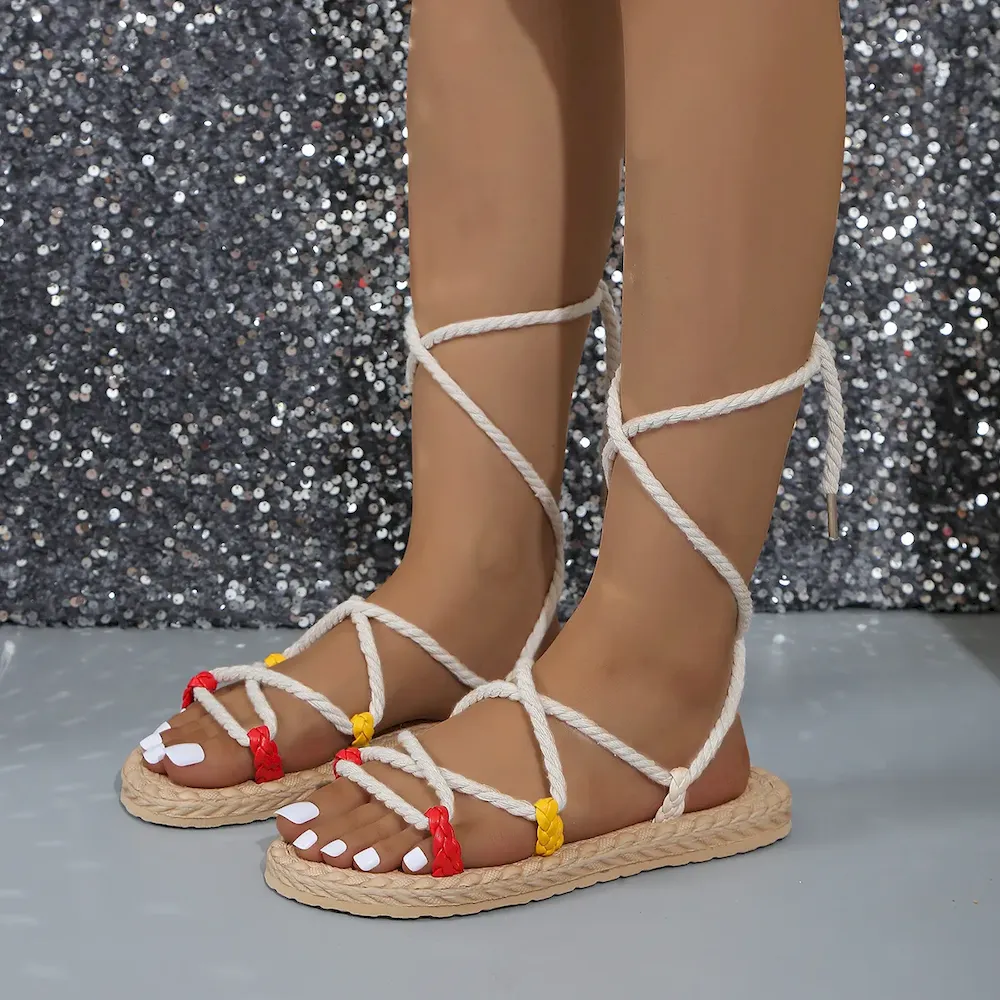 Women Fashion Casual Color-Block Round-Toe Linen Flat Strap Sandals