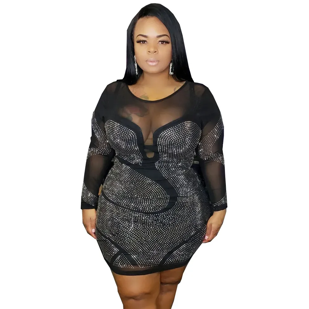 XL-5XL Women Plus Size Sexy Mesh Patchwork Long-sleeve Rhinestone Bodycon Dress