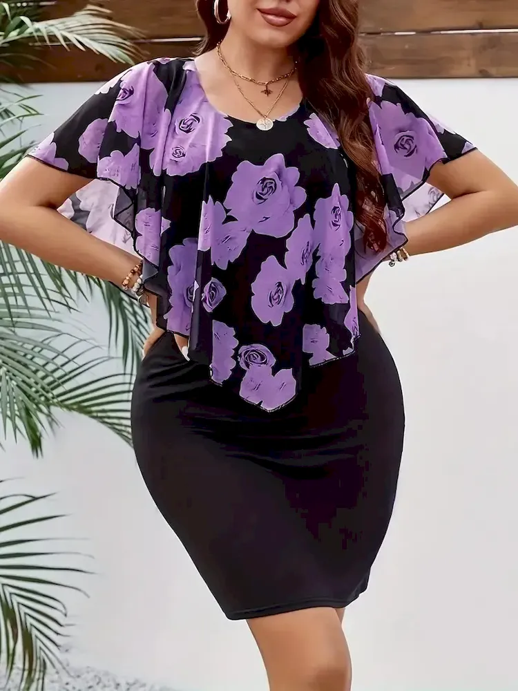 Women Fashion Sexy Plus Size Floral Print Short-Sleeve Slim Fit Dress