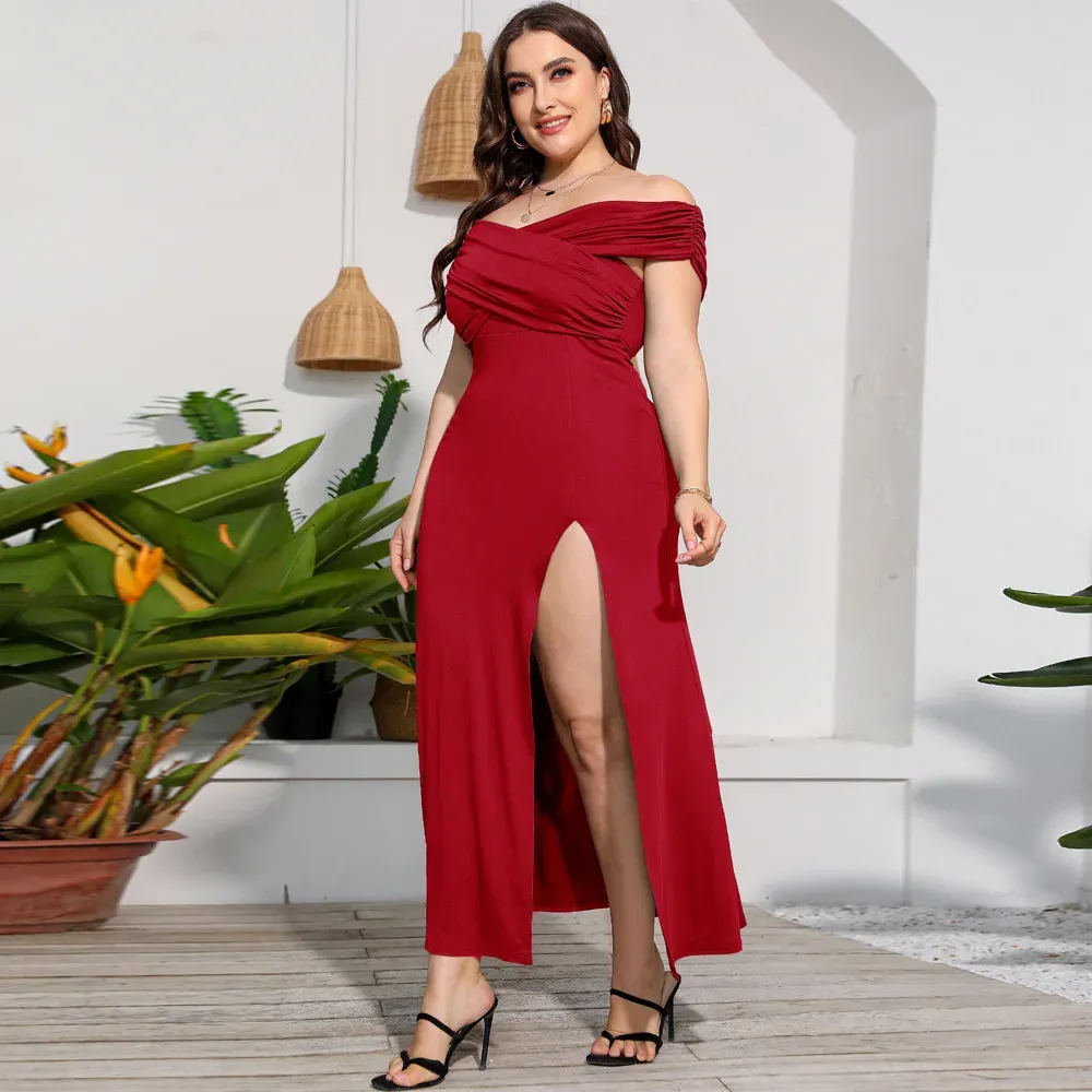 Women Fashion Sexy Solid Color Plus Size Off-The-Shoulder Split Dress