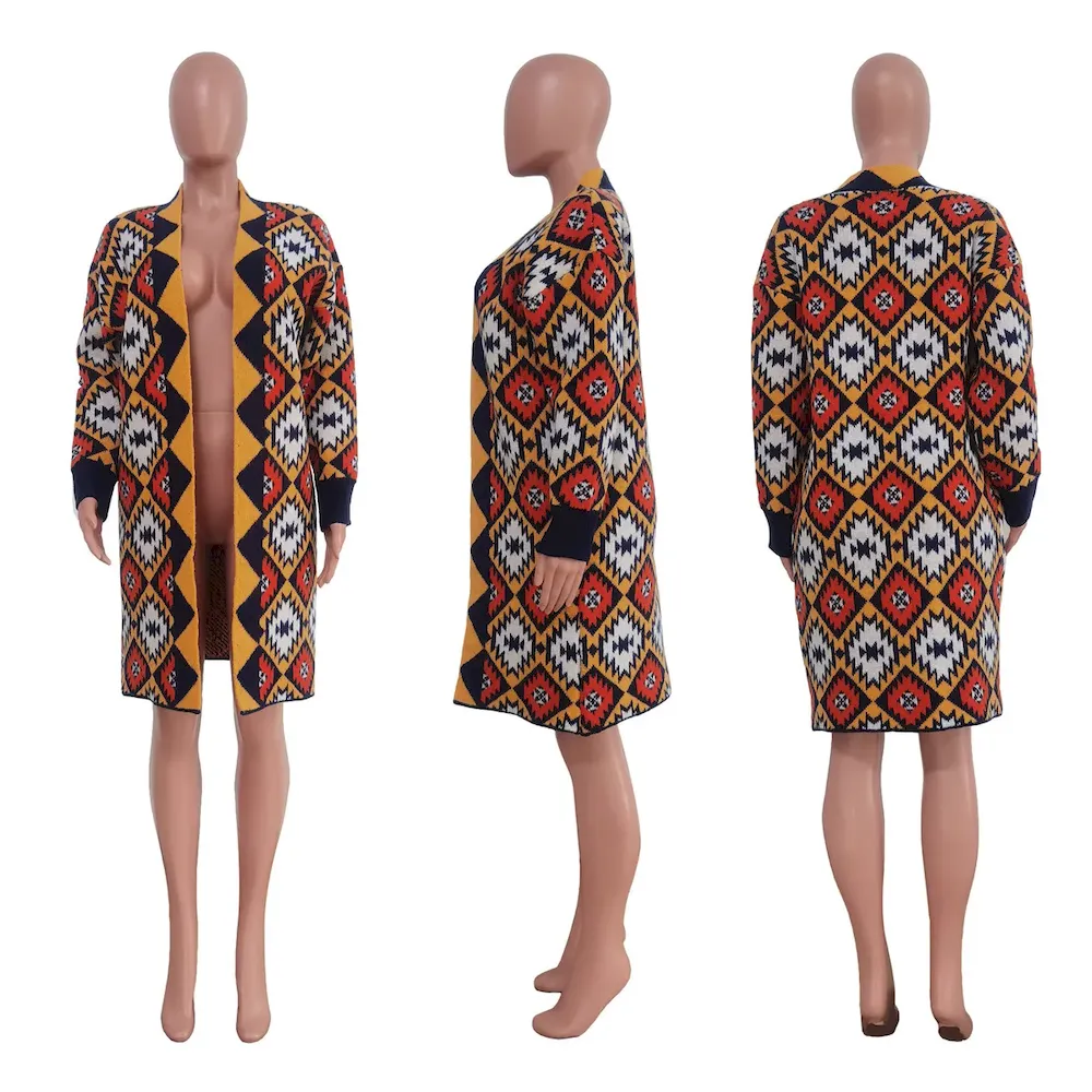 Women Fashion Geometric Long Sleeve Knitted Long Coat